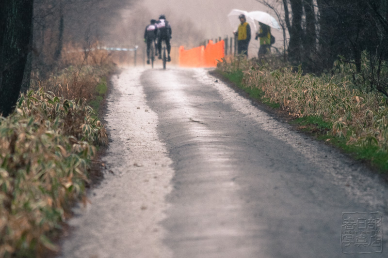 会場となる滝沢牧場の入り口に面する道路を通行止にしてスタートエリアとし左にターンして長〜い登りの舗装路の直線がセッティングされた。泥を走るテクニックと登りを踏み切るパワーが必要なコース。
